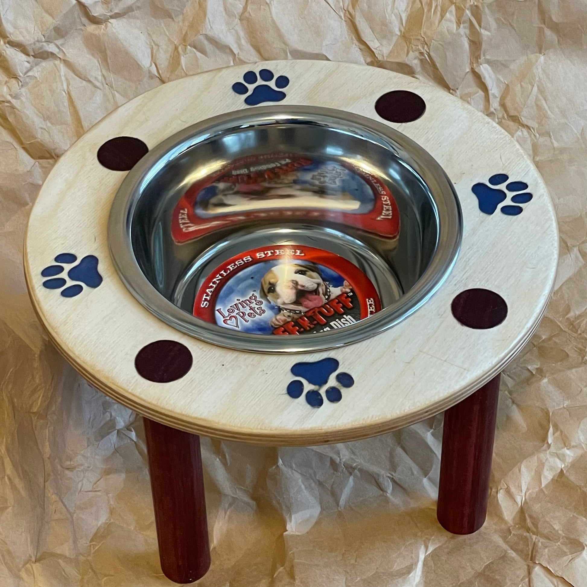 This is our salute to Swedish simplicity. Made with 1/2" birch ply and paw print resin with Maple legs. Stands 6" high Purple Maple Legs Blue Paws