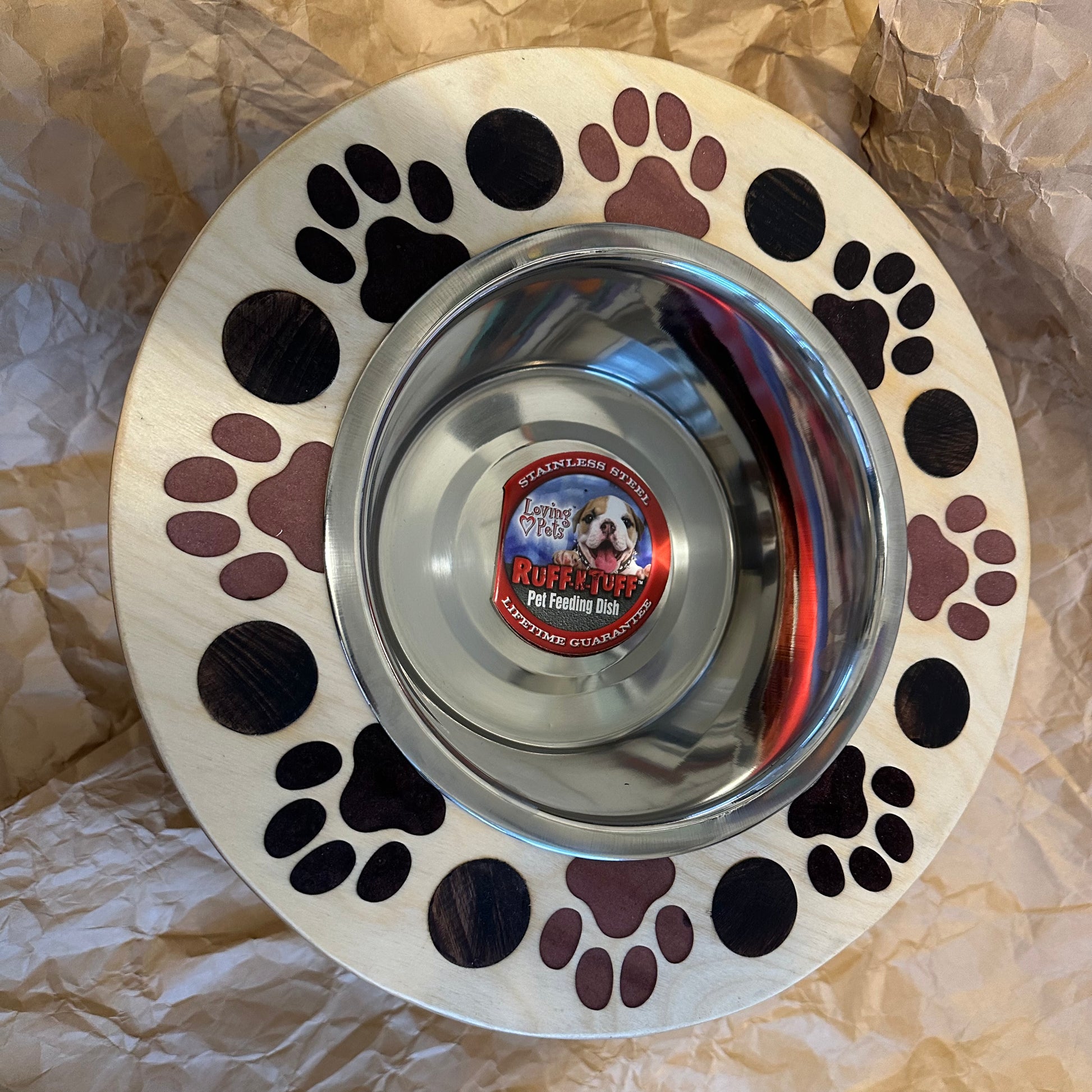 Baltic Birch Single 3 qt 12" raised feeder with burgundy maple legs Paw Inlay