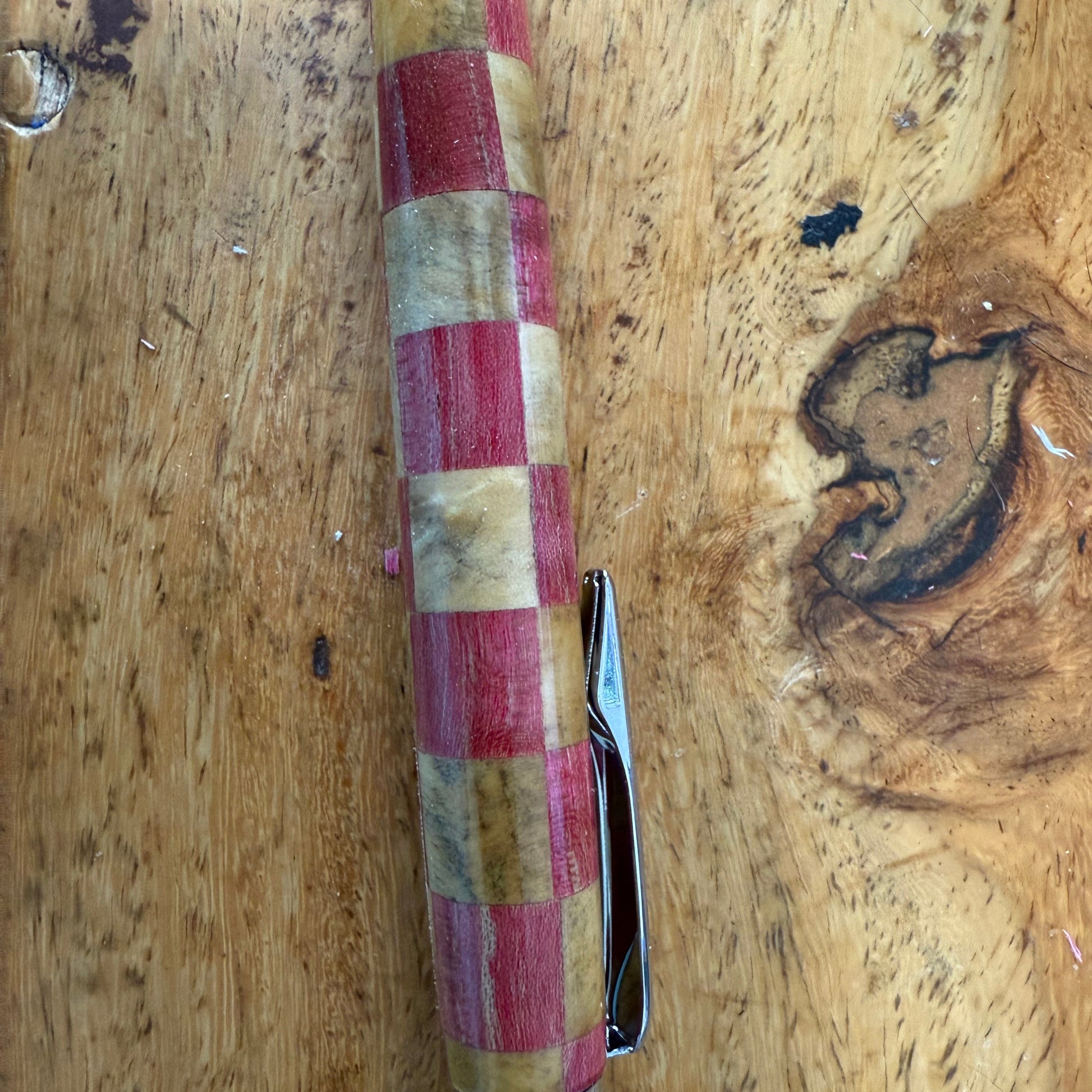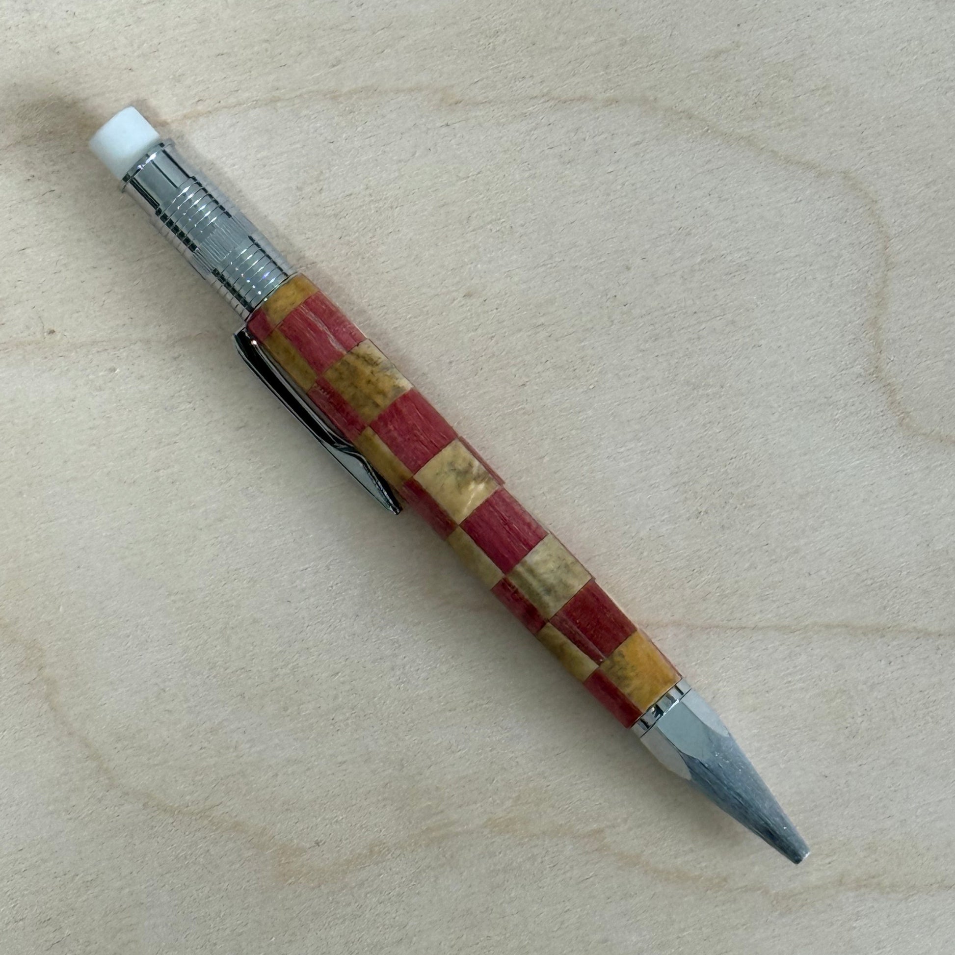 In a checkerboard pattern this two tone segmented mechanical pencil with a steel finish. It has a built in Sharpener Dyed maple and a natural burl.