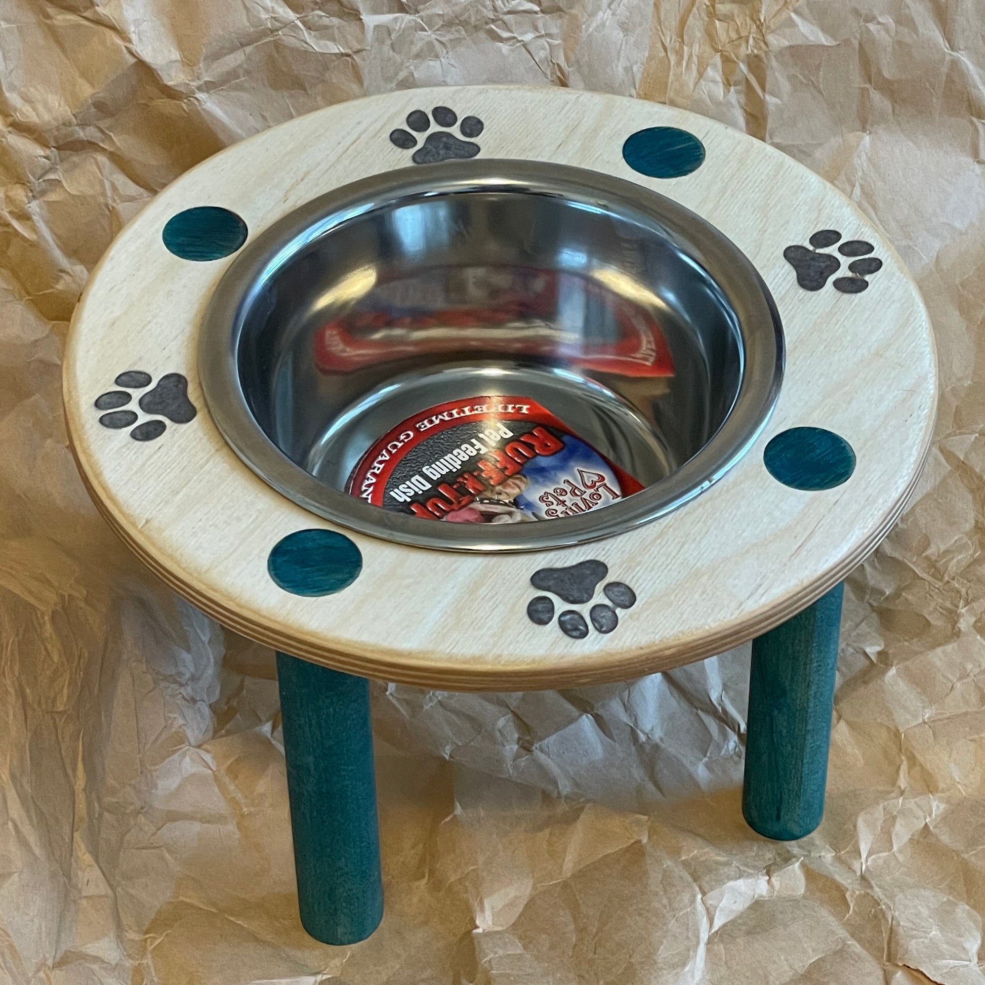 Baltic Birch Single 1 qt 6" raised feeder with teal maple legs grey paws