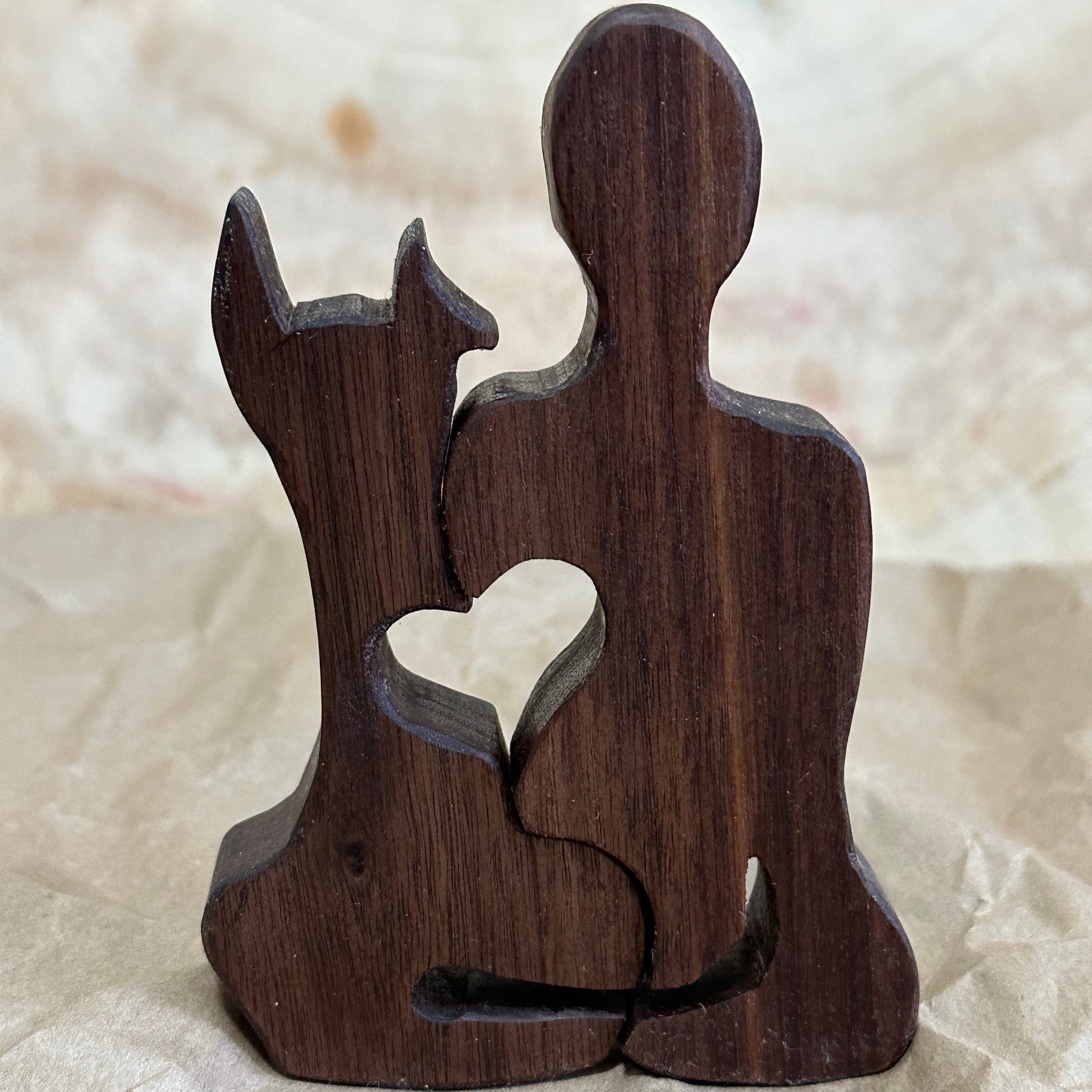 Great Danes have a unique bond with their humans, but that connection can be found with any breed of dog. This beautiful sculpture, made of 3/4 inch walnut with a walnut base, stands 5 inches high and 3.5 inches wide. Each piece is custom-made, so please allow 3 weeks for delivery.