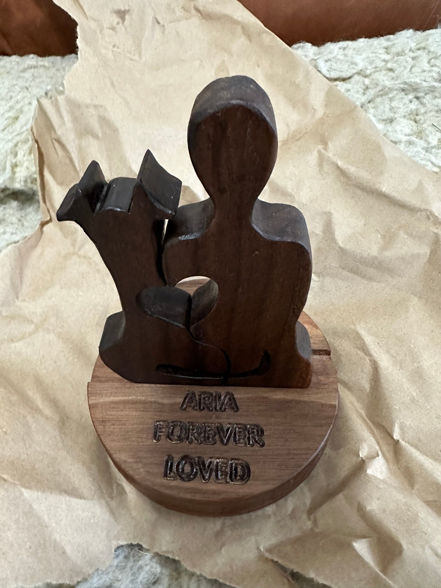 Great Danes have a unique bond with their humans, but that connection can be found with any breed of dog. This beautiful sculpture, made of 3/4 inch walnut with a walnut base, stands 5 inches high and 3.5 inches wide. Each piece is custom-made, so please allow 3 weeks for delivery.
