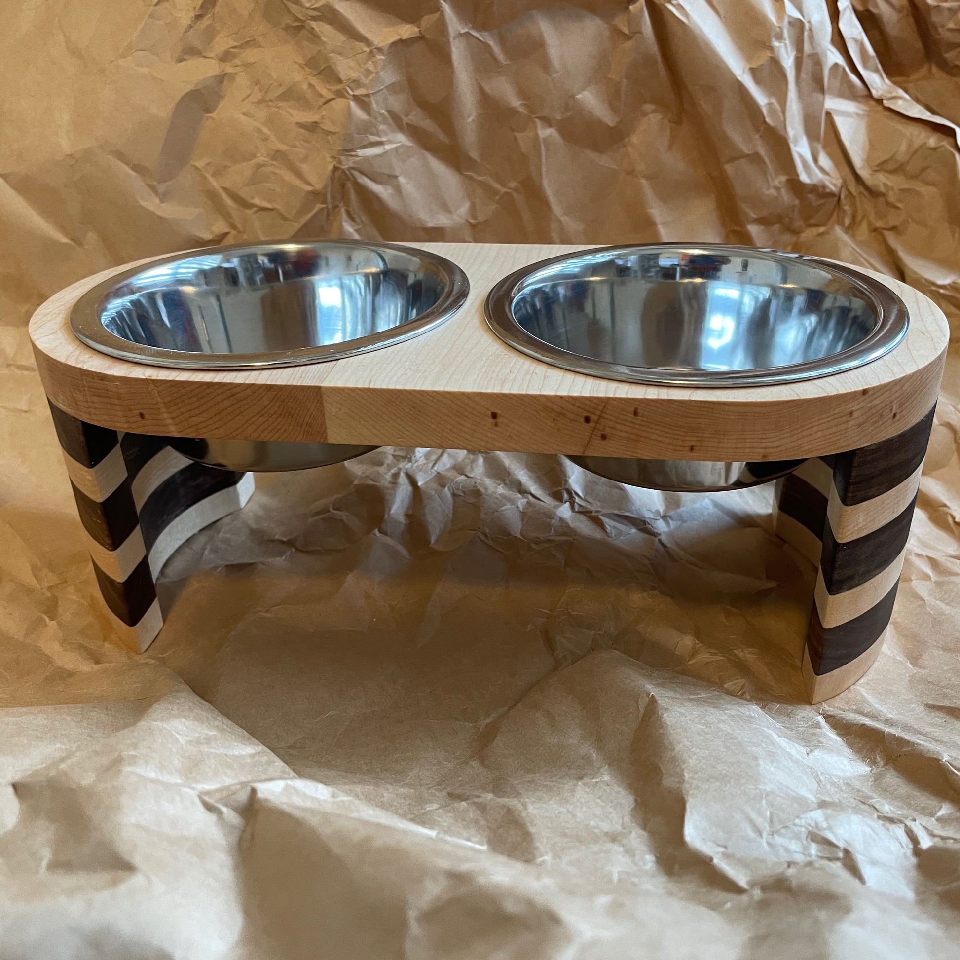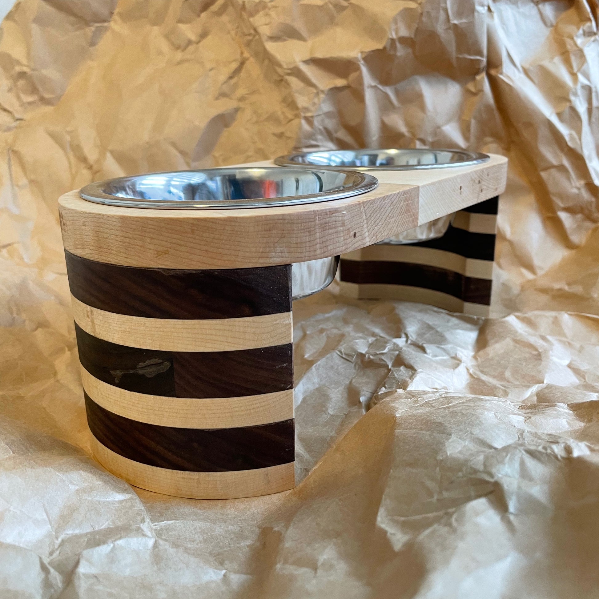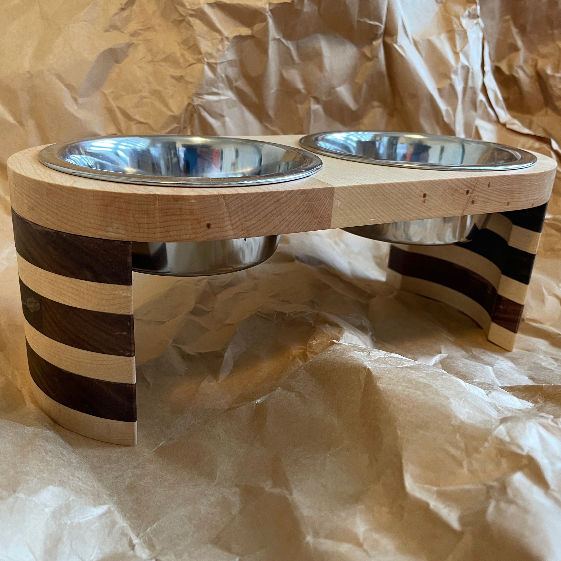 Beautifully made from solid maple and walnut, this raised double dog feeder combines timeless craftsmanship with a modern striped design. The natural wood tones add warmth and style, making it a perfect fit for any kitchen décor or pet feeding area.