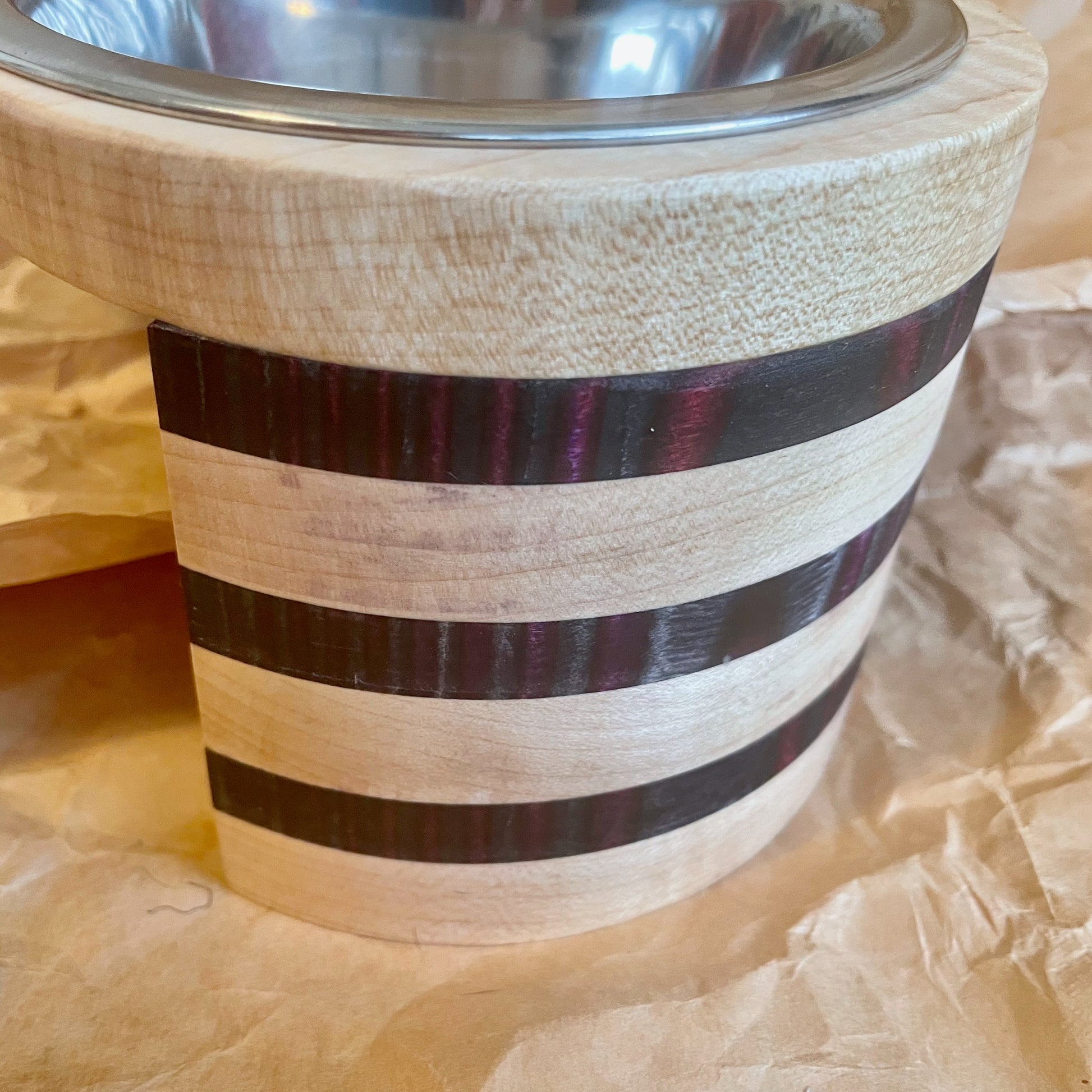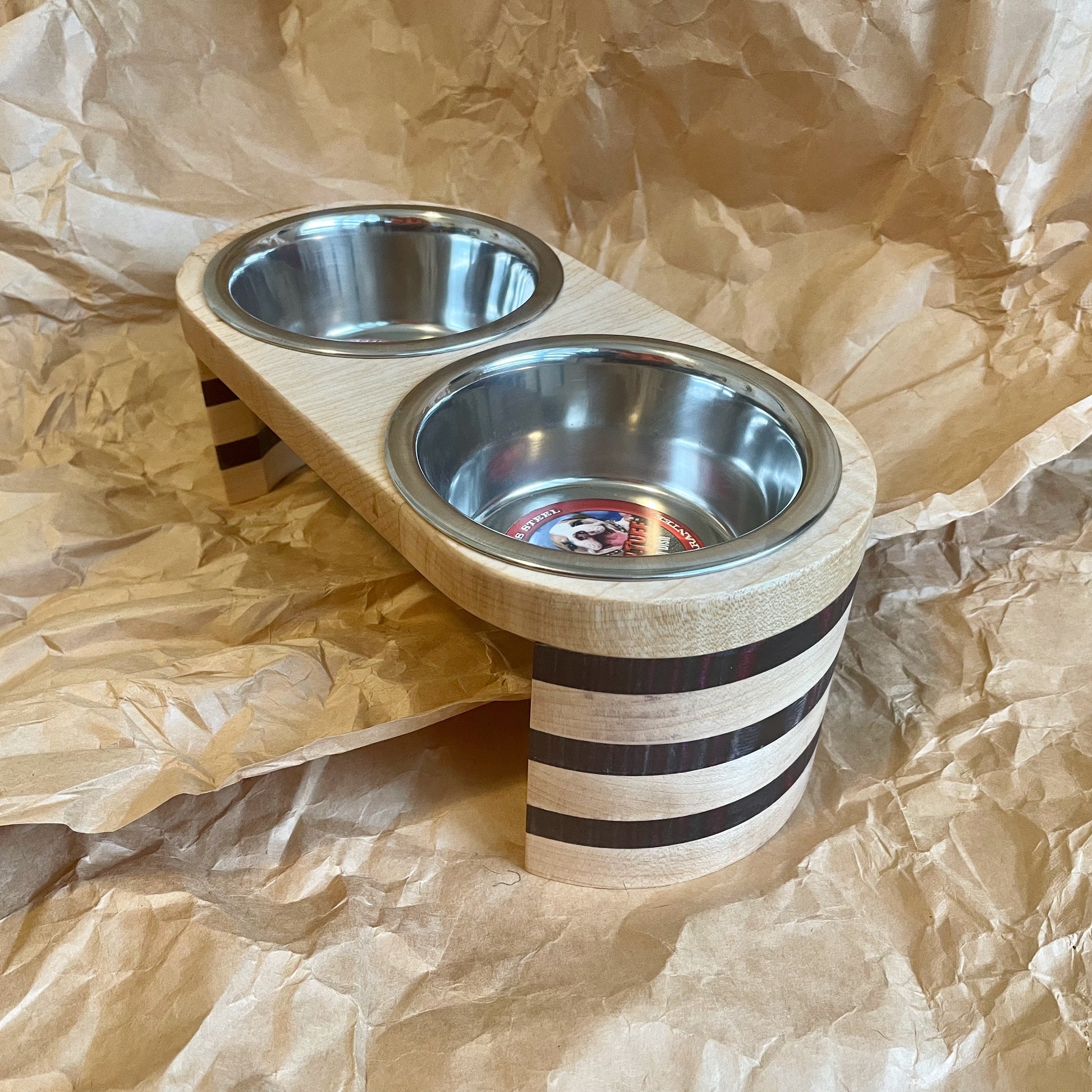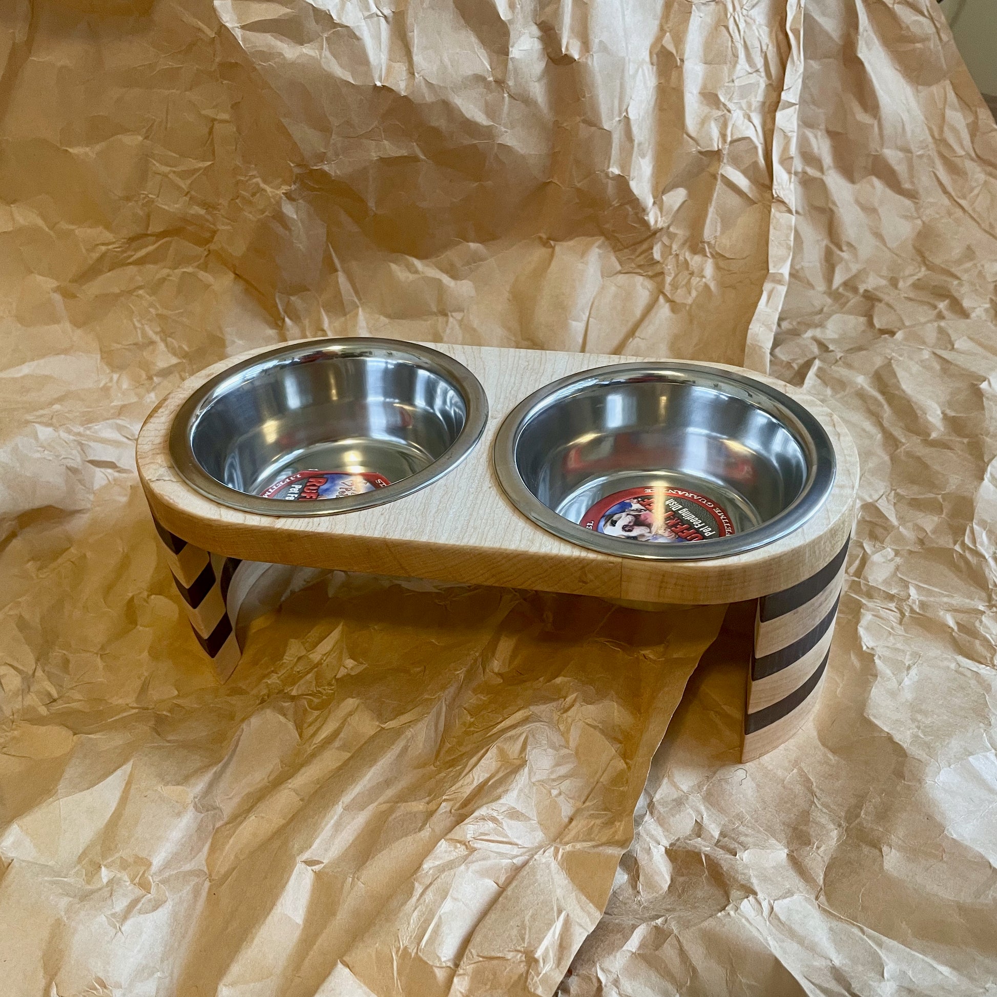 Beautifully made from solid maple and walnut, this raised double dog feeder combines timeless craftsmanship with a modern striped design. The natural wood tones add warmth and style, making it a perfect fit for any kitchen décor or pet feeding area.