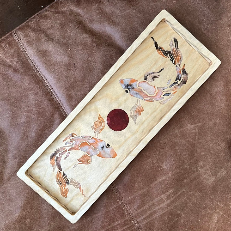 Wow imagine serving up smoked salmon or an arrangement of sushi. Engraved with a resin inlay. Ready for Sushi or what you can dream up!. Finished with a food grade wax and ready to go! This one is a show stopper. Approximate 6.5"x17"