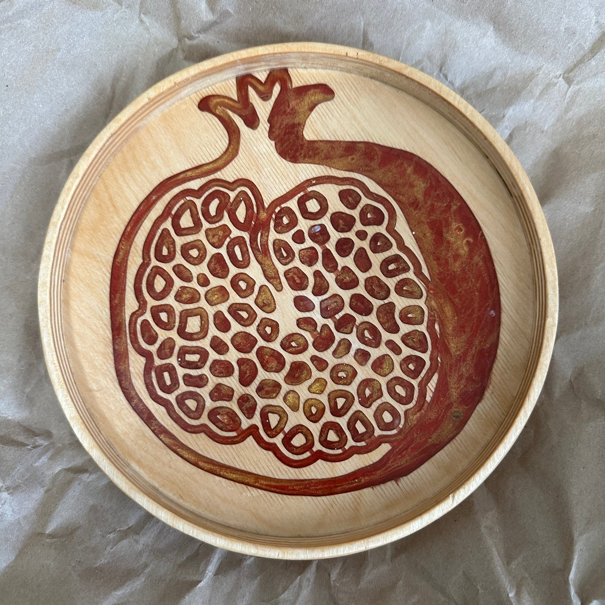 This lovely trinket or food tray is approximately 8.5" dia. Engraved with a resin inlay. Ready for Sushi or just trinkets!. Finished with a food grade wax and ready to go!