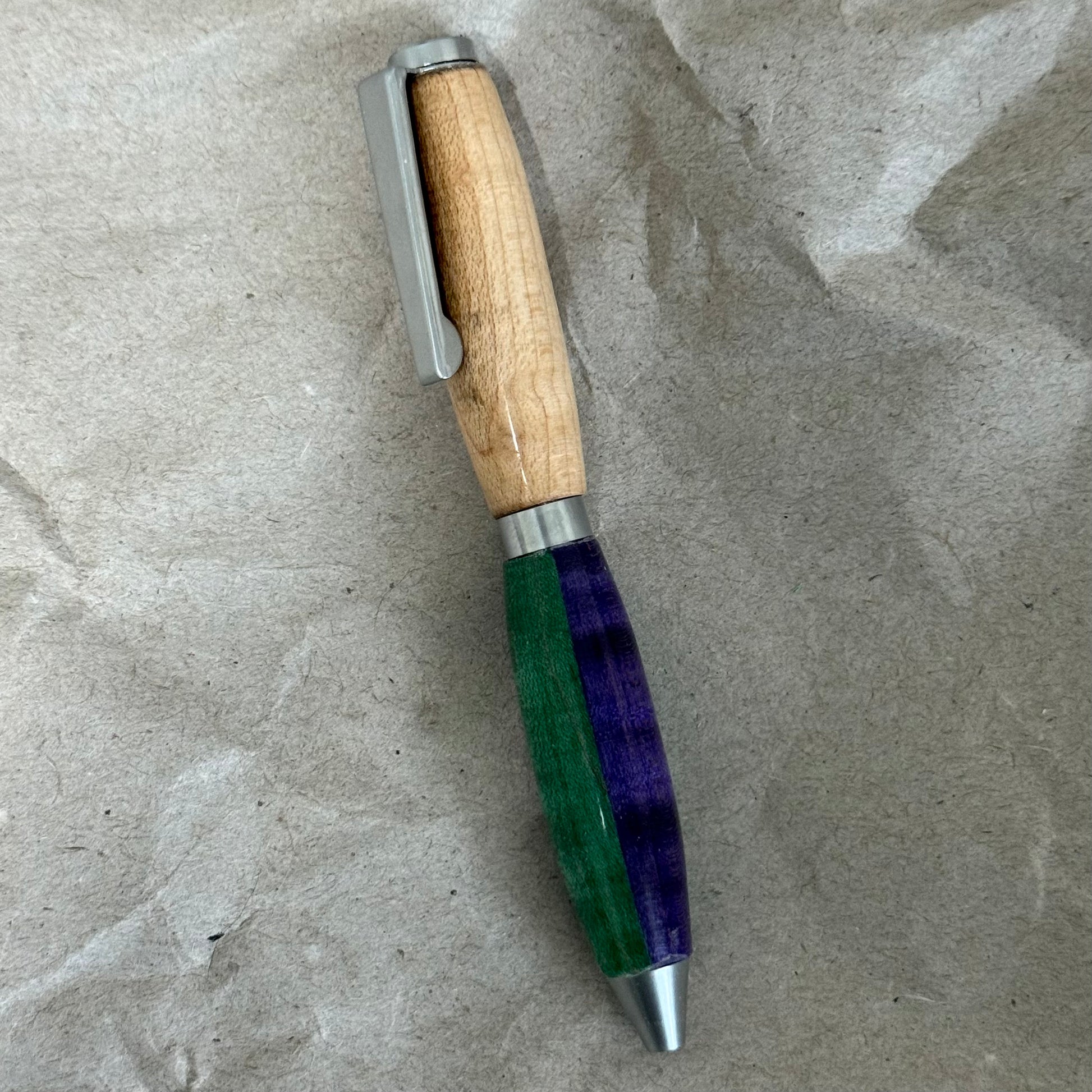 Gorgeous ergonomic purse pen fits your hand and writes so smoothly. Silver finished hardware. Upper is a burl and the bottom is a combination of blue and green dyed maple