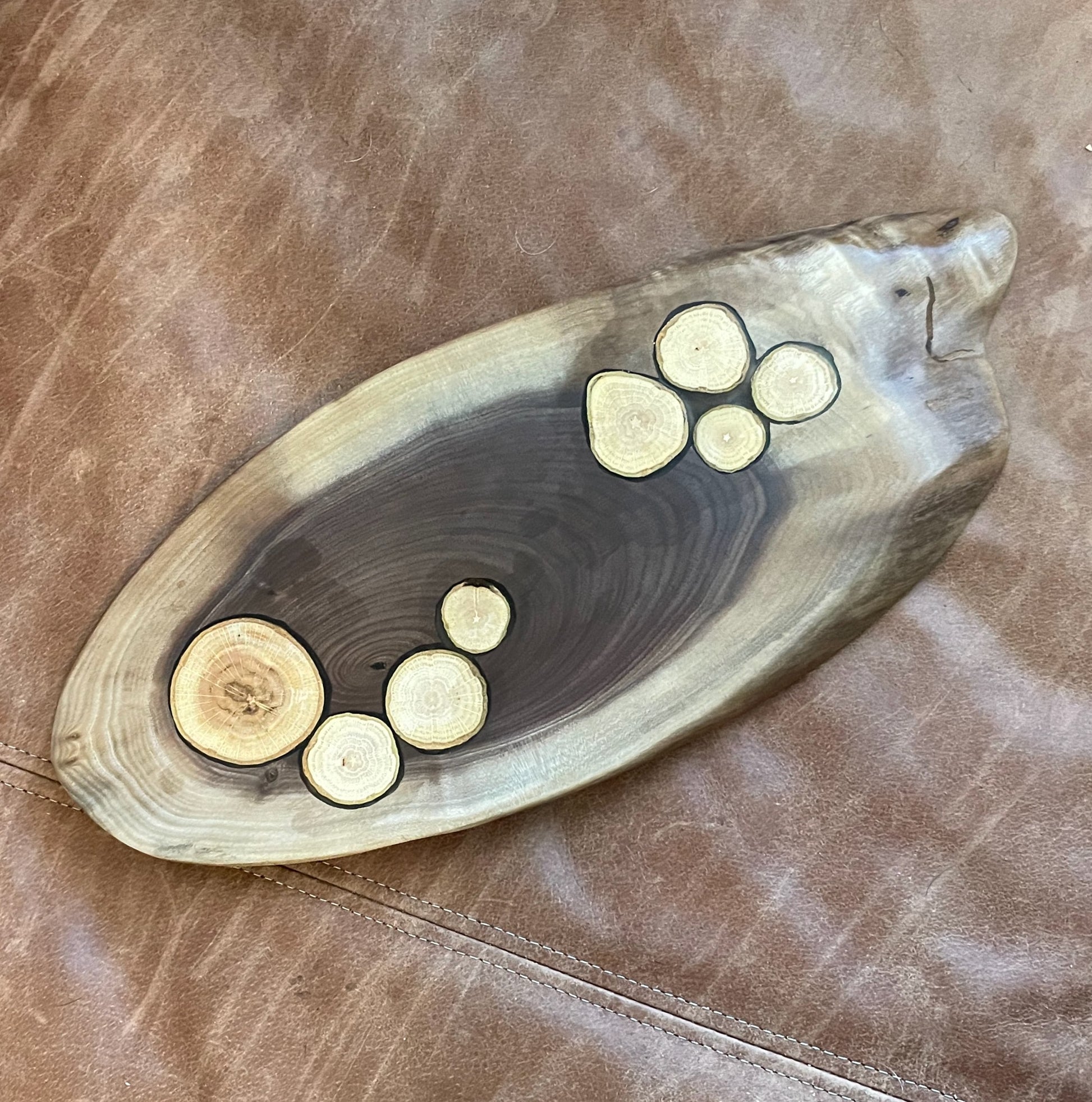 This beautifully shaped board will make a statement on any occasion. A nice compact size to display cheese or other charcuterie Hand finished with a food grade finish. A real party pleaser. Be sure to ask about custom pieces. No two pieces will be alike