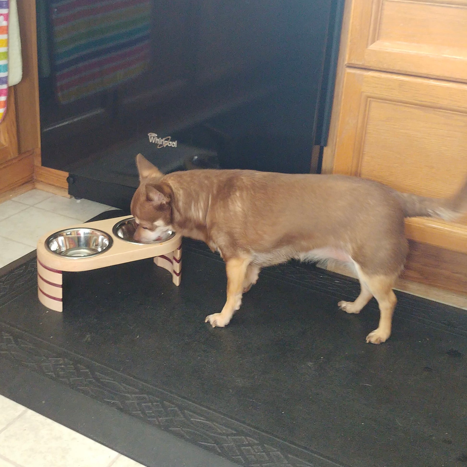 Beautifully handcrafted maple and purple heart wood small feeder. Perfect for little dogs and cats! Height 3.75" x10" long x 5.25" wide Comes with 2-1 pint stainless steel dishes.